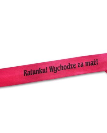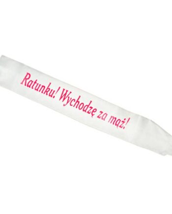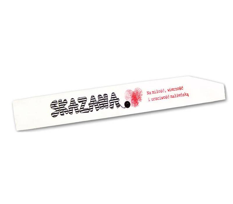 Szarfa biała z różowym nadrukiem “SKAZANA Na miłość, wierność i uczciwość małżeńską” o całkowitej długości ok 75 cm (obwód 150 cm) oraz szerokości 10 cm. Idealny prezent z okazji wieczoru panieńskiego, ślubu.