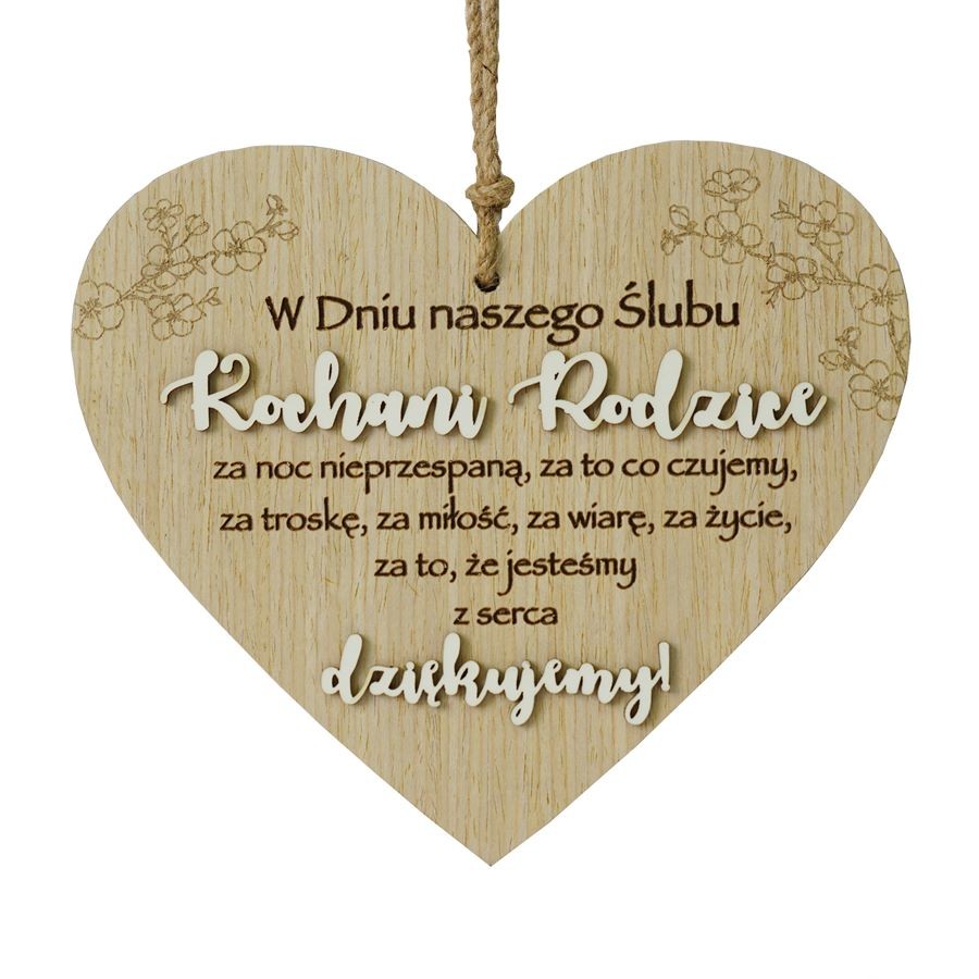 Tabliczka w kształcie serca, pięknie zdobiona to wspaniały, niezapomniany pomysł w ramach podziękowań dla rodziców. Tabliczka z grawerowaną sentencją przewieszona naturalnym sznurkiem, dzięki czemu można ją zawiesić na ścianie. wielkość orientacyjna: 20,5×17,5 cm