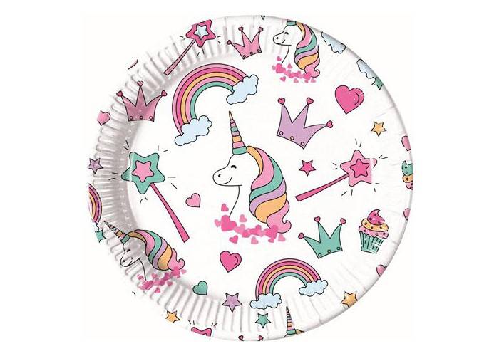 Papierowe talerzyki o średnicy 23 cm z wizerunkiem jednorożca. Lekkie, wytrzymałe i bezpieczne dla dzieci.