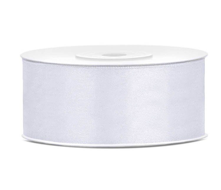 Tasiemka satynowa w kolorze białym, szerokość 25 milimetrów, długość 25 metrów.