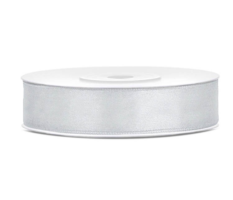Tasiemka satynowa w kolorze srebrnym, szerokość 12 milimetrów, długość 25 metrów