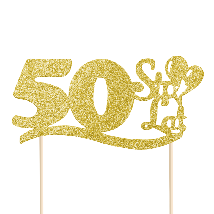 Topper na tort 50 urodziny wykonany z papieru brokatowego w kolorze złotym, wysokość ok. 19 x 14 cm.