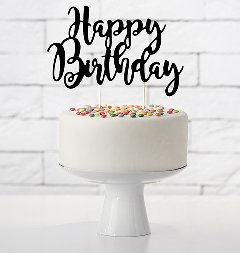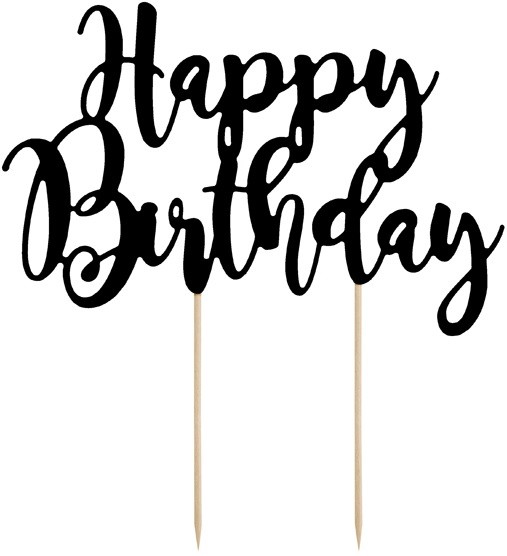 Topper na tort Happy Birthday, wykonany z papieru lustrzanego w kolorze czarnym, wysokość ok. 22,5 cm.