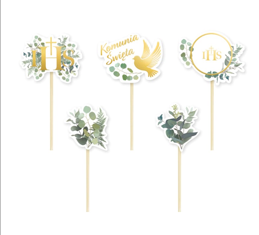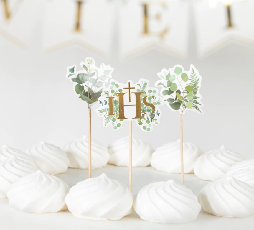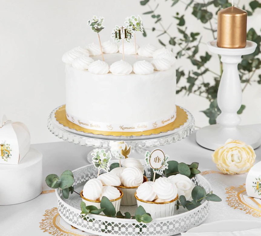Topery komunijne ze złotym motywem IHS i gołąbkiem oraz liśćmi eukaliptusa. Pięknie udekorują każdy komunijny stół. Sprawdzą się na torcie, cieście, ciasteczkach czy przekąskach.