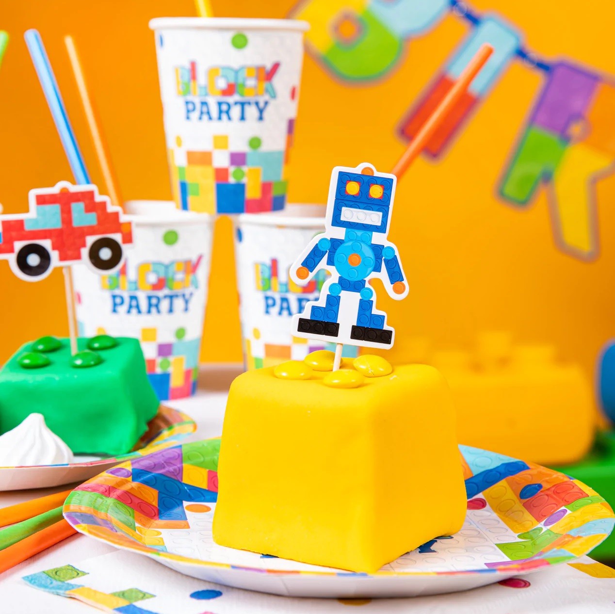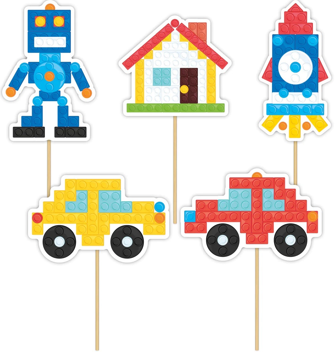 Toppery na tort to idealne uzupełnienie kolekcji Klocki.  W zestawie znajduje się 5 szt.uk topperów z motywami robota, rakiety, domku, czerwonego i żółtego auta. Fantastyczna propozycja na dziecięce przyjęcie.