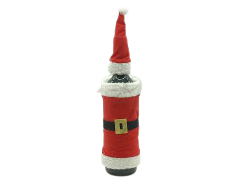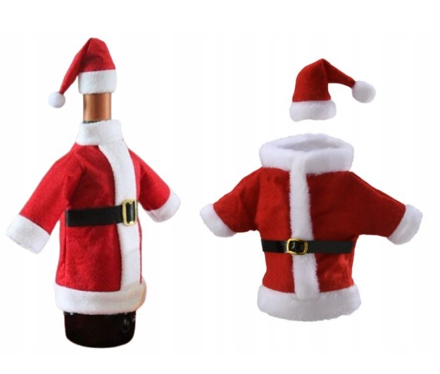Ubranko na butelkę świąteczną. Zawiera pokrowiec oraz czapeczkę. Rozmiar uniwersalny: obwód pokrowca 24 cm, wysokość 20 cm.