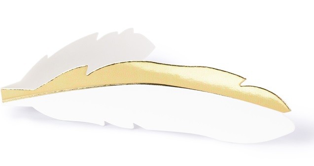 Wizytówki na stół w kształcie piórka, wykonane z papieru w kolorze białym ze złotym metalizowanym brzegiem, wymiary po złożeniu ok. 10,5 x 3 cm.