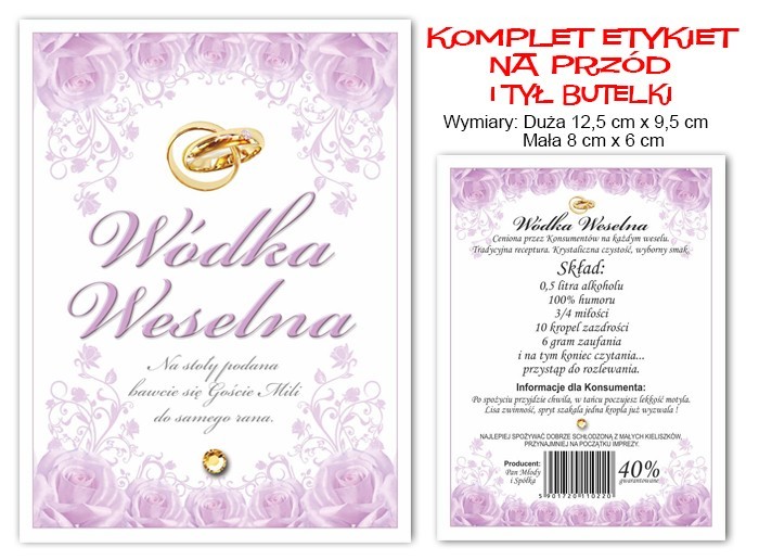 Zestaw etykiet na dwie strony butelki. Niedroga dekoracja butelek z alkoholem. Łatwa do zamocowania, na zasadzie naklejki samoprzylepnej. Profesjonalny druk offsetowy gwarantuje, że nadruk nie rozmaże się pod wpływem wilgoci np. z lodówki.