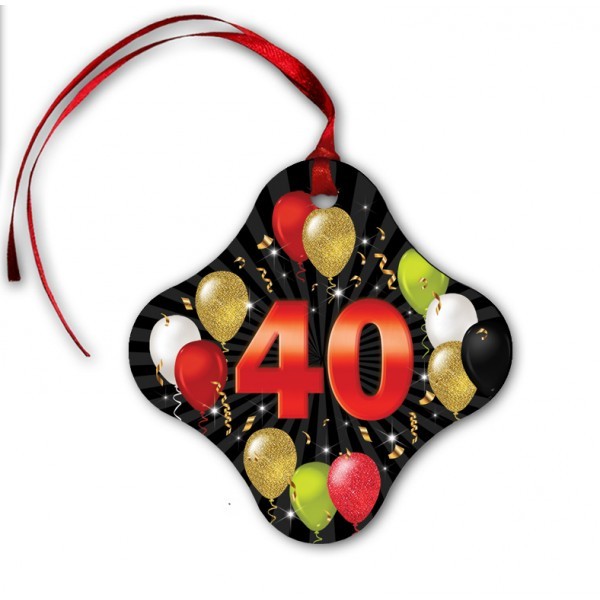 Zawieszka z kolorowym, urodzinowym nadrukiem na 40 urodziny. Do zawieszki przyczepiona atłasowa wstążeczka. Szerokość zawieszki po przekątnej około 8,5 cm. Opakowanie 20 szt.