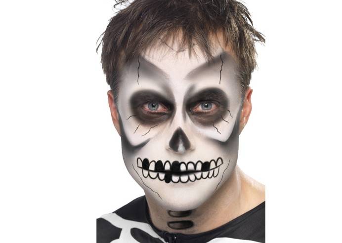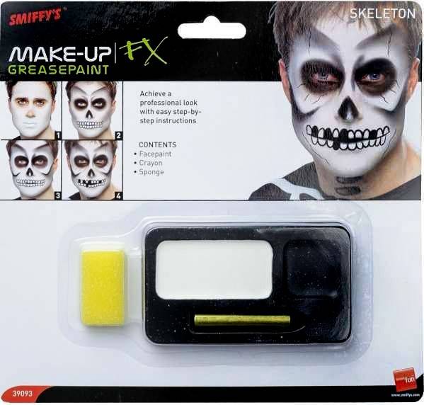 Zestaw do makijażu Szkieletora. W komplecie: farbka czarna (1g), farbka biała (2g) , czarna kredka (1,6g), gąbeczka i instrukcja wykonania makijażu szkieletora.