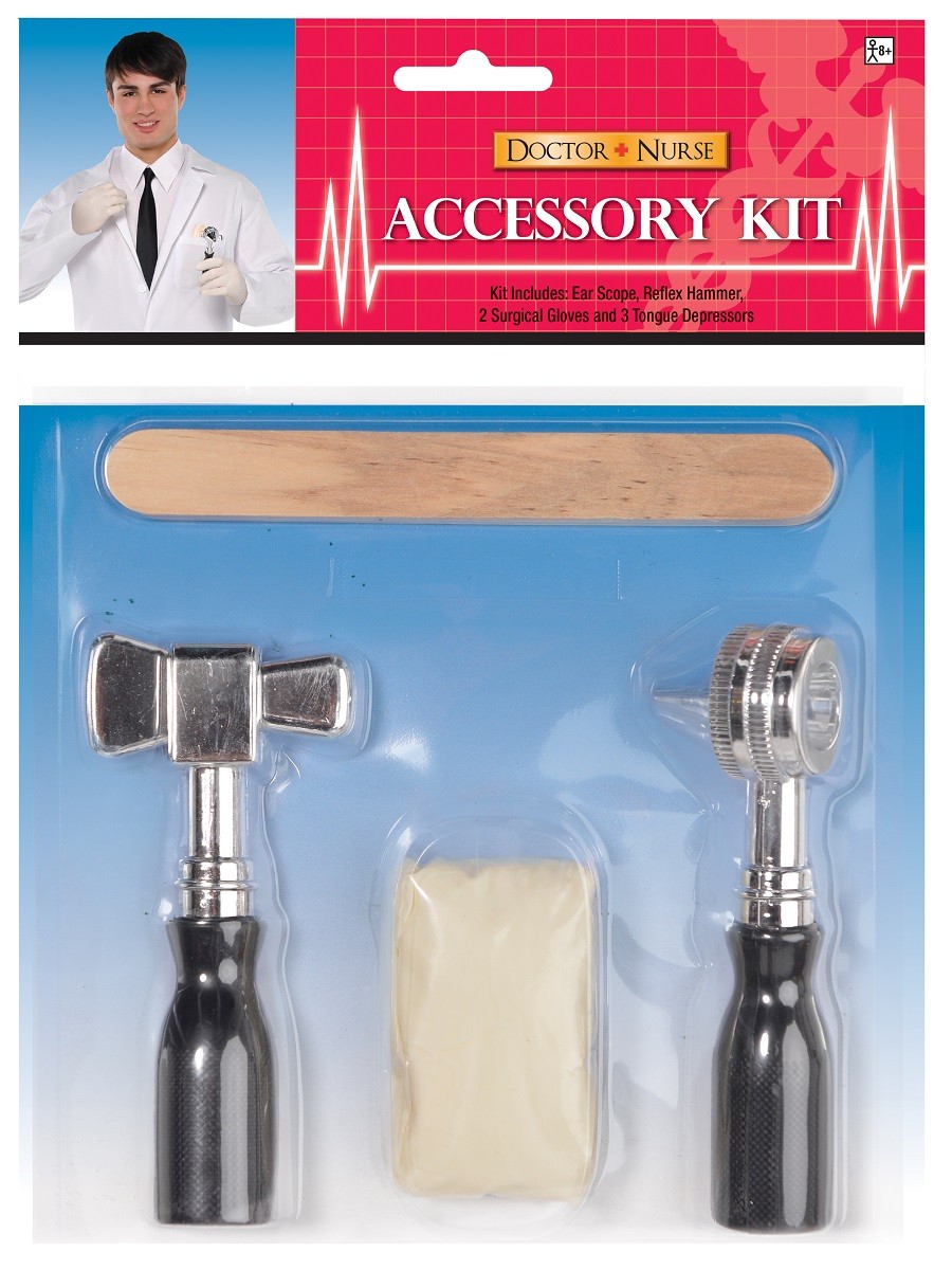 Zestaw narzędzi lekarza. Dokosnały dodatek do stroju doktorka. W zestawie znajdują się 3 drewniane szpatułki (15 cm), rękawiczki chirurgiczne, wziernik uszny (13 cm) oraz młoteczek (12 cm).