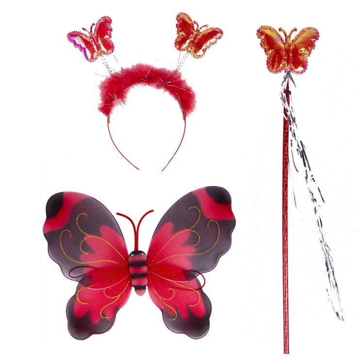 Skrzydła usztywnione drutem, mocowane na ramiączkach z gumki, motyle mocowane na opasce na głowę