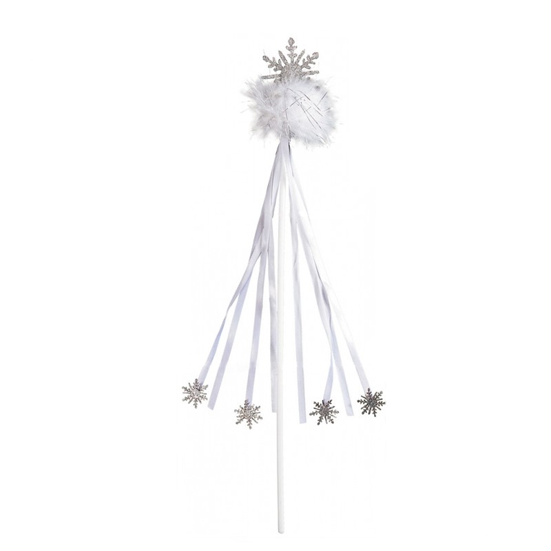 Plastikowa Różdżka ozdobiona srebrną śnieżynką, białym puszkiem i wstążeczkami z małymi srebrnymi śnieżynkami.
